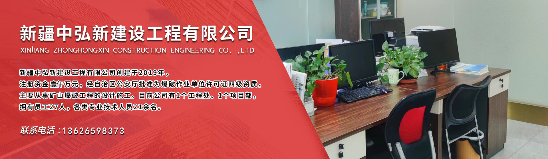 ZHONGHONGXIN CONSTRUCTION ENGINEERING 公 司 簡 介新疆中弘新建設(shè)工程有限公司創(chuàng)建于2019年,注冊資金壹仟萬元,經(jīng)自治區(qū)公安廳批準(zhǔn)為爆破作業(yè)單位許可證四級資質(zhì),主要從事礦山爆破工程的設(shè)計施工、礦上采掘施工業(yè)務(wù)。目前公司有1個工程處、2個項(xiàng)目部,分...